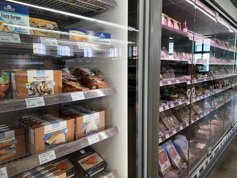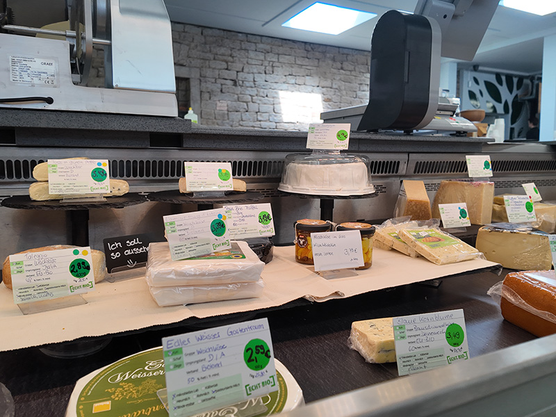 Im Markt gibt es eine Auswahl an Milch und diversen Milchalternativen sowie vielen weiteren Frischeprodukten. Dazu gehören u.a. Joghurt, Frischkäse, Kefir, Butter, Margarine, Feta und verschiedene Schnittkäse. Ergänzt wird das Sortiment durch Tofu, Tempeh und diverse vegane Alternativen. Außerdem sind fermentiertes Gemüse, frische Nudeln, Fleisch- und Wurstwaren sowie saisonale Spezialitäten, etwa zu Weihnachten oder Ostern vertreten.